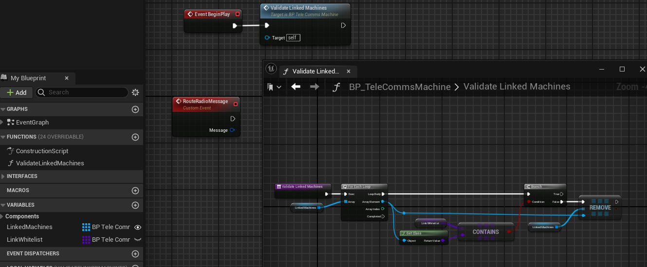 The machines for now would have the ability to directly link them via the Editor, adding any following machines to the preceding one's array. This is then verified at game start. In the future this is where multi tool and wiring functionality could be added to enable dynamically built setups, however, it is out of the scope of this system. Additionally the RouteRadioMessage function will facilitate that need to pass data between machines.