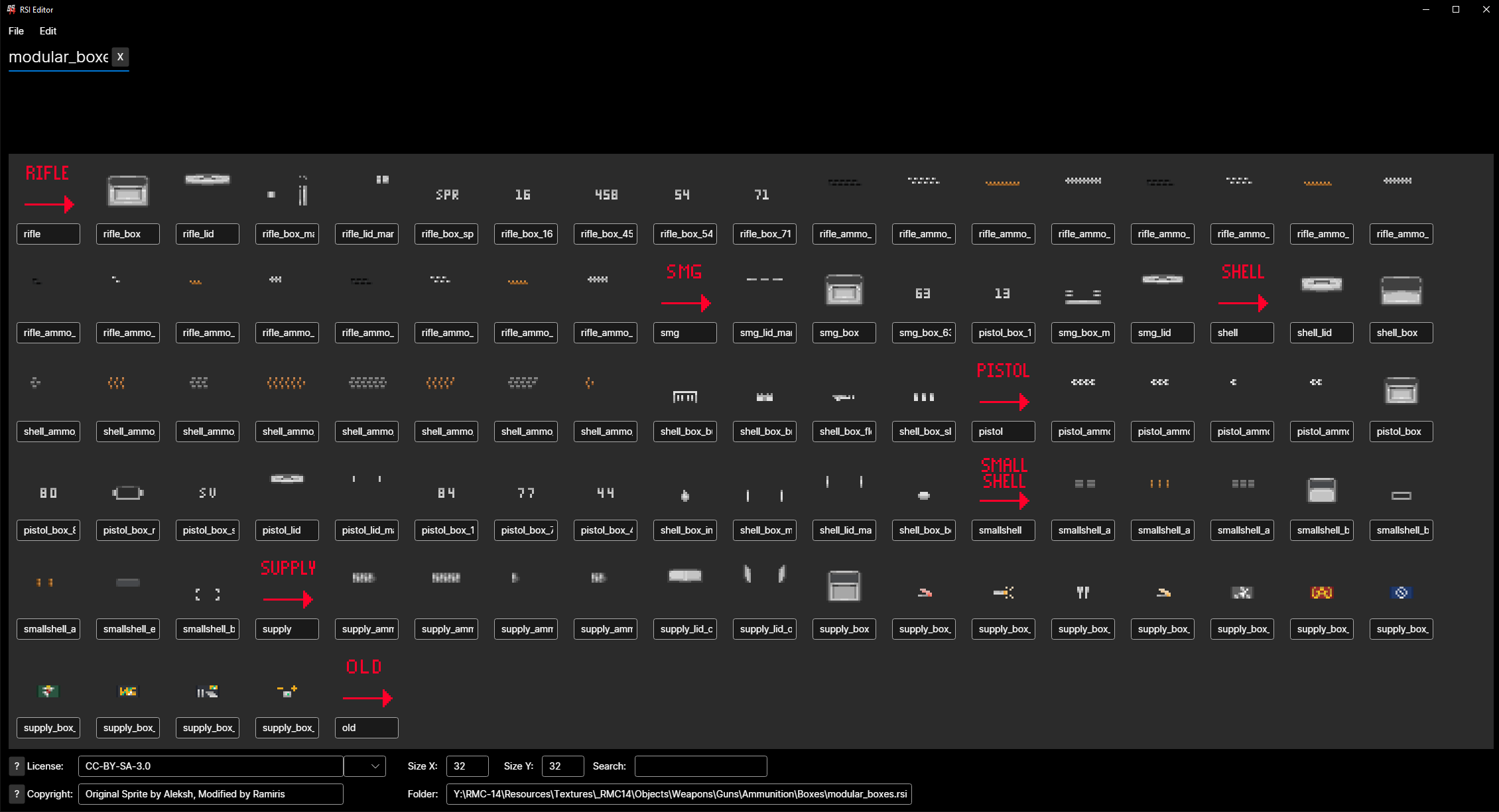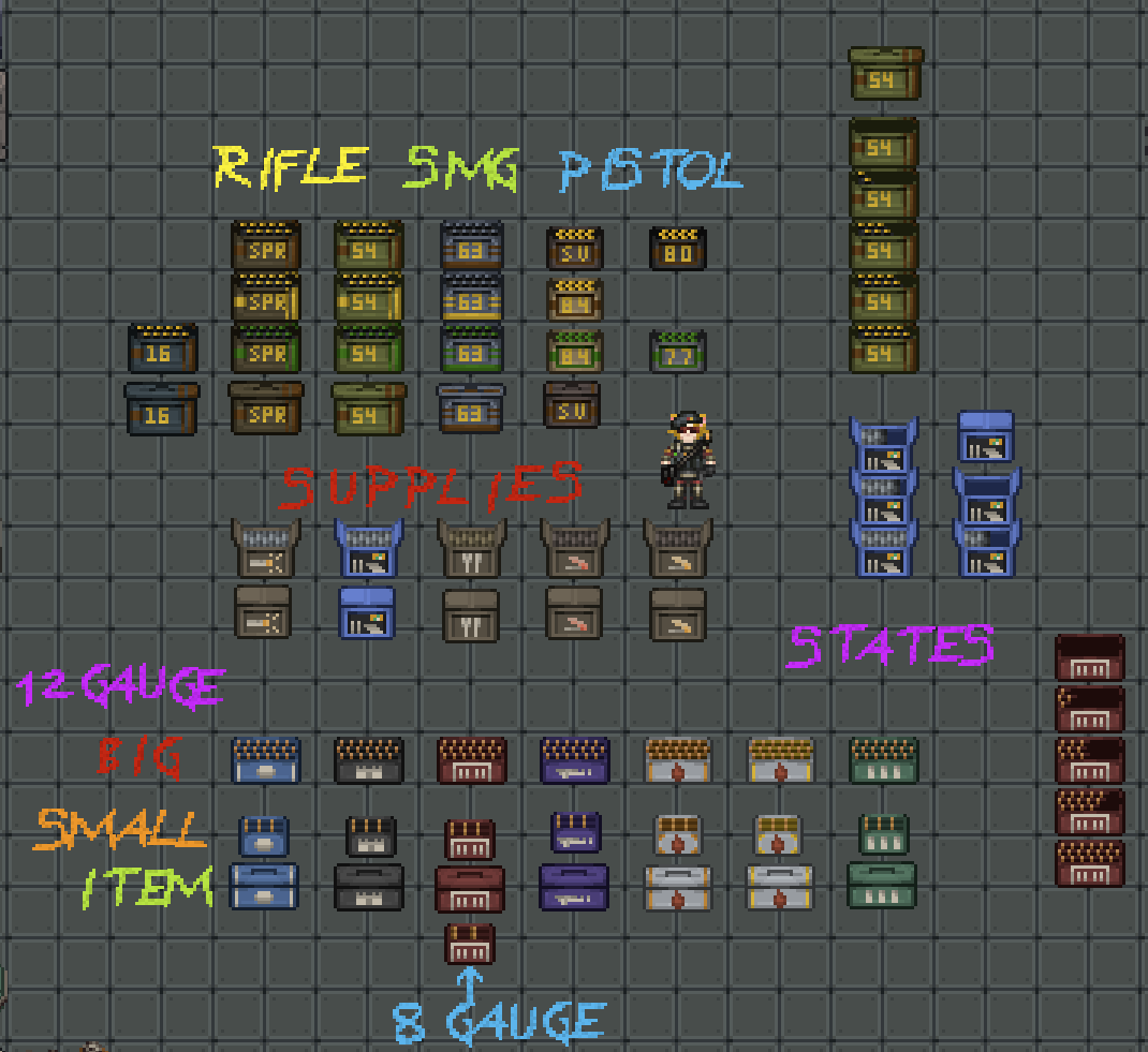 My first contributions to the project were initially in the form of a simple resprite of the ammunition and magazine boxes the game used. Simple enough on its own, however as I began working with a spriter (artist) on this, I found that the old legacy system used a combination of over 500 different sprites in order to create their visuals for roughly 50 items in the game. This was, quite frankly, absurd and could certainly be improved in a few areas. Most specifically the fact that many sprites were identical if not for colour.